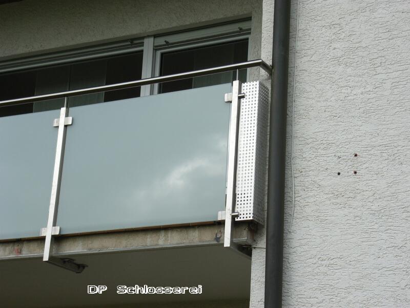 Fachgerechte Demontage und Entsorgung des maroden Balkongeländers. Die neuen Geländerstützen aus Edelstahl - Vierkantrohr 40 x 40 mm werden nun von unten an dei Balkonplatte gedübelt. Dieses verhindert zuverlässig das Eindringen von Regenwasser und Frost in das Bauwerk. Die Geländerfüllungen bestehen aus Verbund - Sicherheitsglas mit weißer Zwischenfolie.